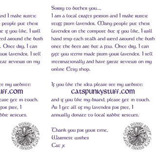 Lavender wands are quite fragile so for the post I have made some printed labels to fit underneath wide Sellotape, warning the postal service that there is dried lavender in the box. Having worked in the courier industry for 25 years I know that it is only a matter of time before one of these wands gets severely damaged, so I'm hoping these labels will offer a bit of extra protection.